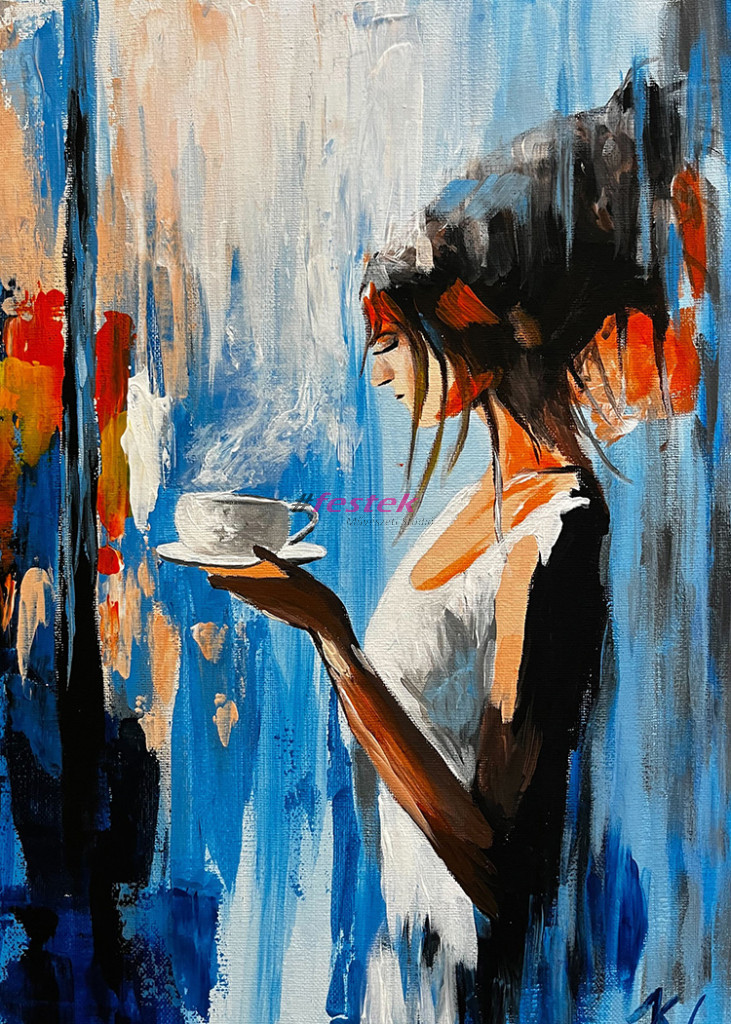 Kézzel festett akril festmény fa keretre feszített vásznon.