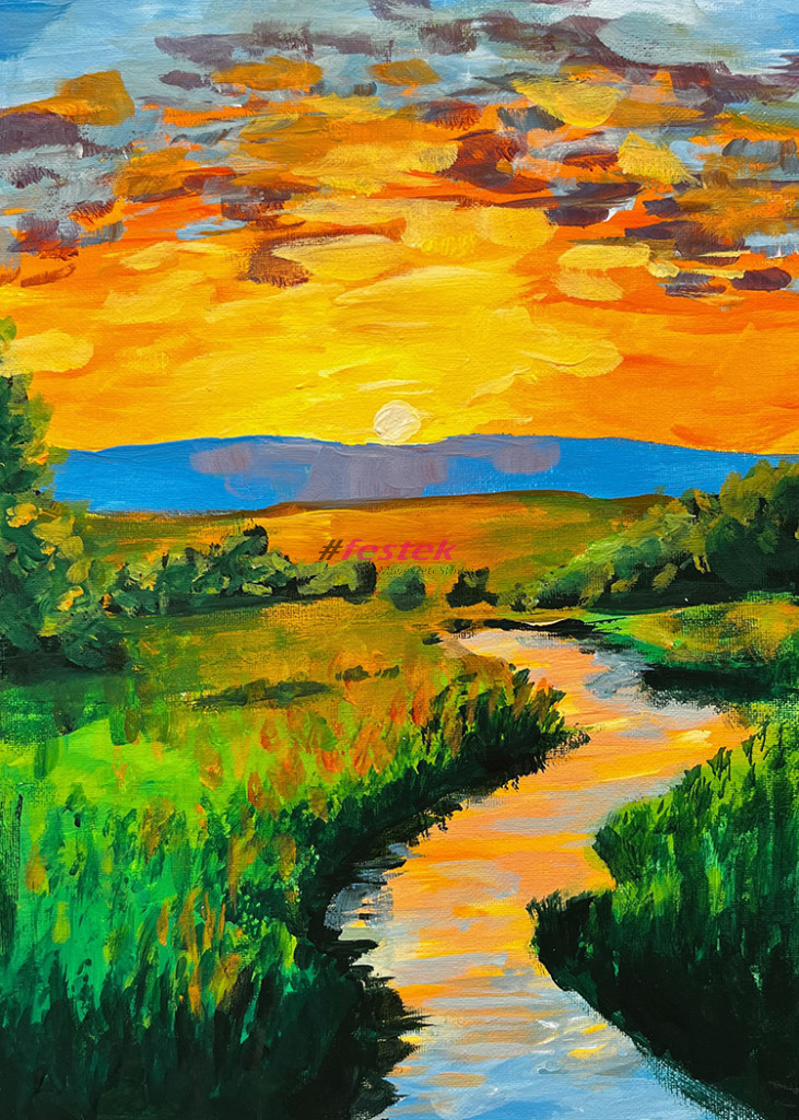 Kézzel festett akril festmény fa keretre feszített vásznon.