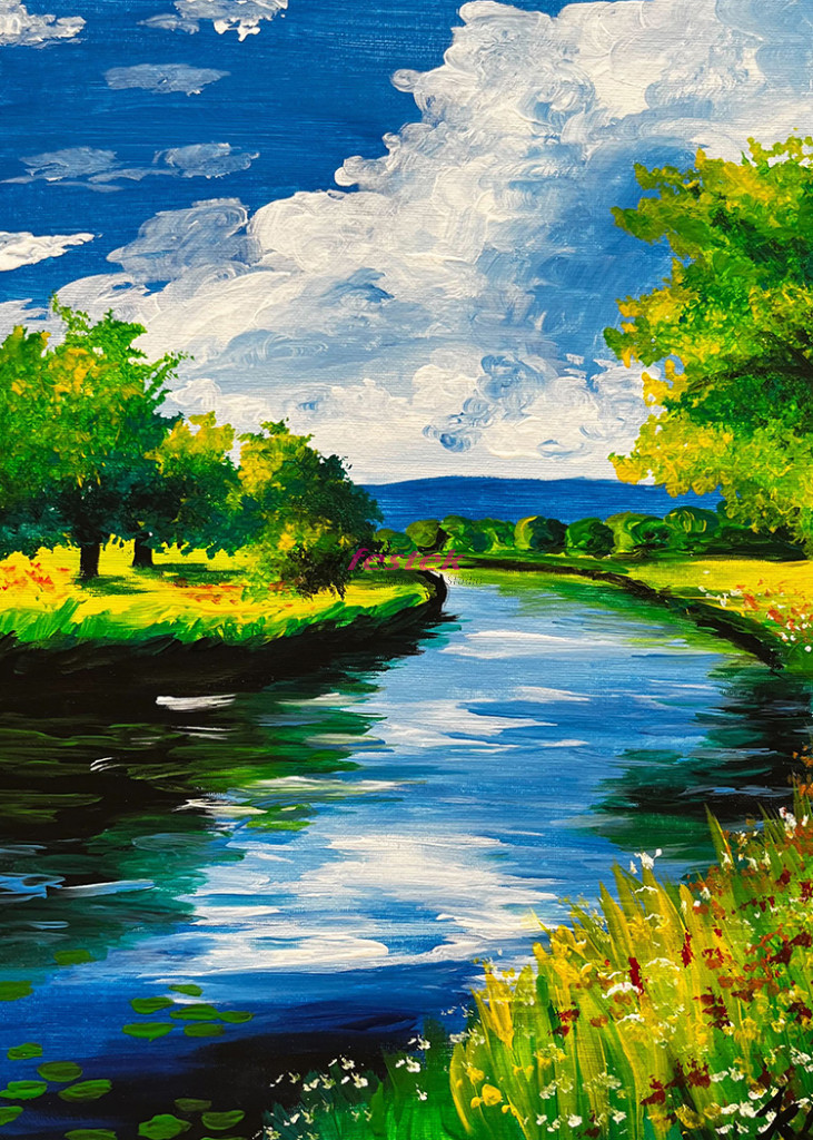 Kézzel festett akril festmény fa keretre feszített vásznon.