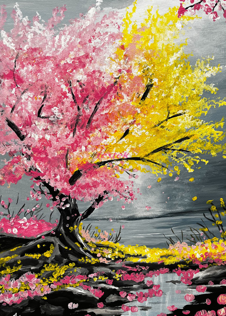 Kézzel festett akril festmény fa keretre feszített vásznon.
