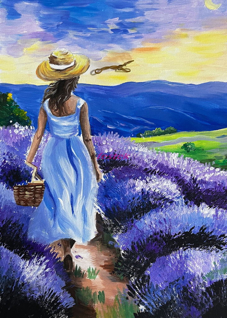 Kézzel festett akril festmény fa keretre feszített vásznon.