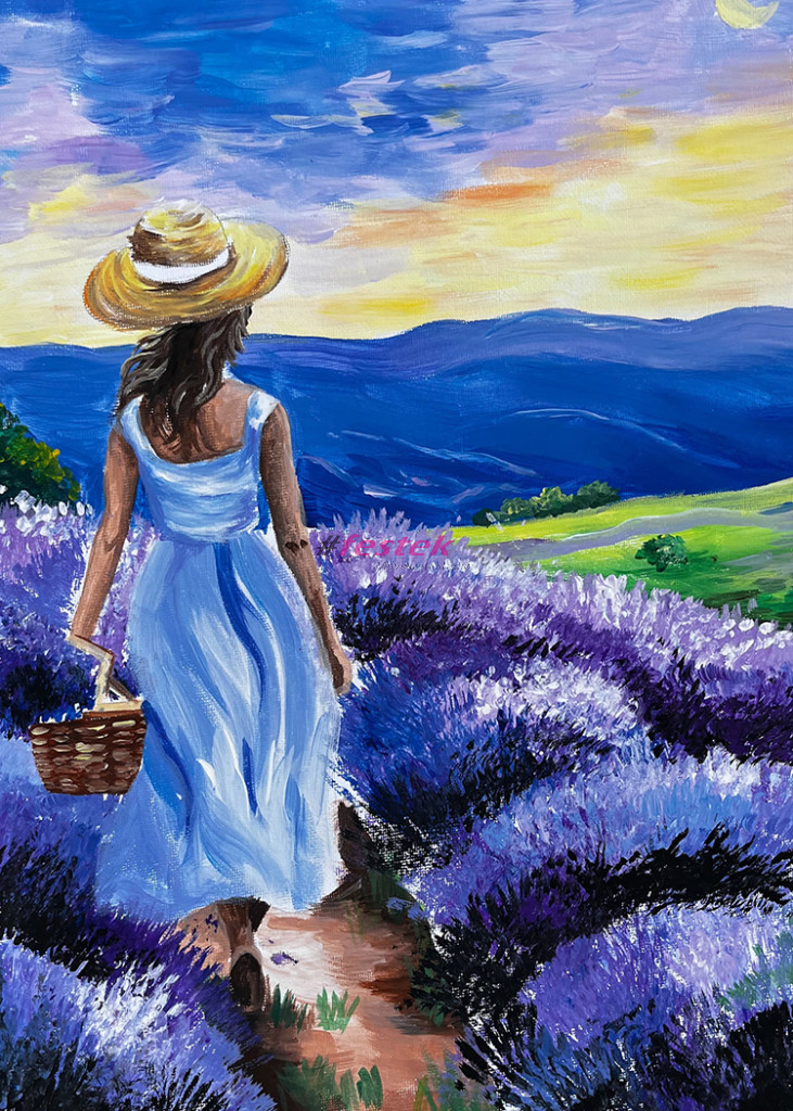 Kézzel festett akril festmény fa keretre feszített vásznon.