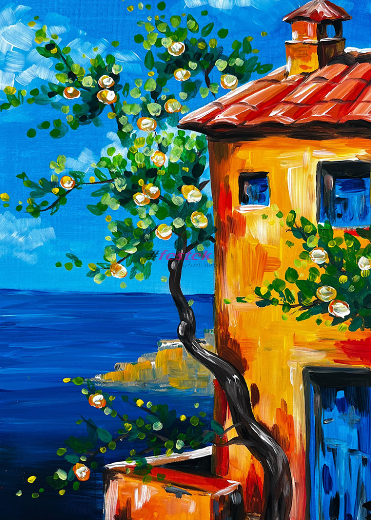 Kézzel festett akril festmény fa keretre feszített vásznon.