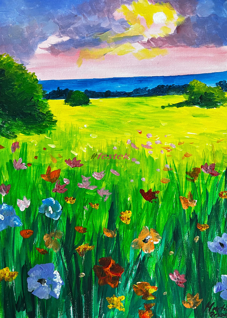 Kézzel festett akril festmény fa keretre feszített vásznon.