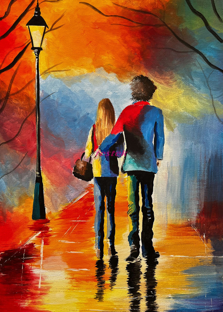 Kézzel festett akril festmény fa keretre feszített vásznon.