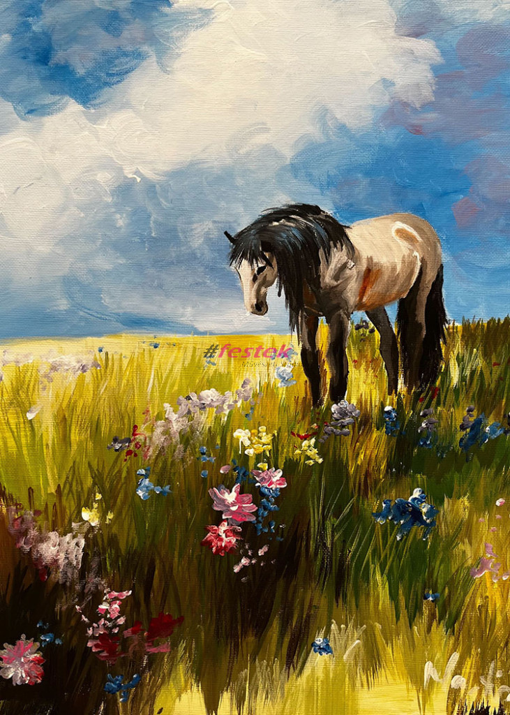 Kézzel festett akril festmény fa keretre feszített vásznon.