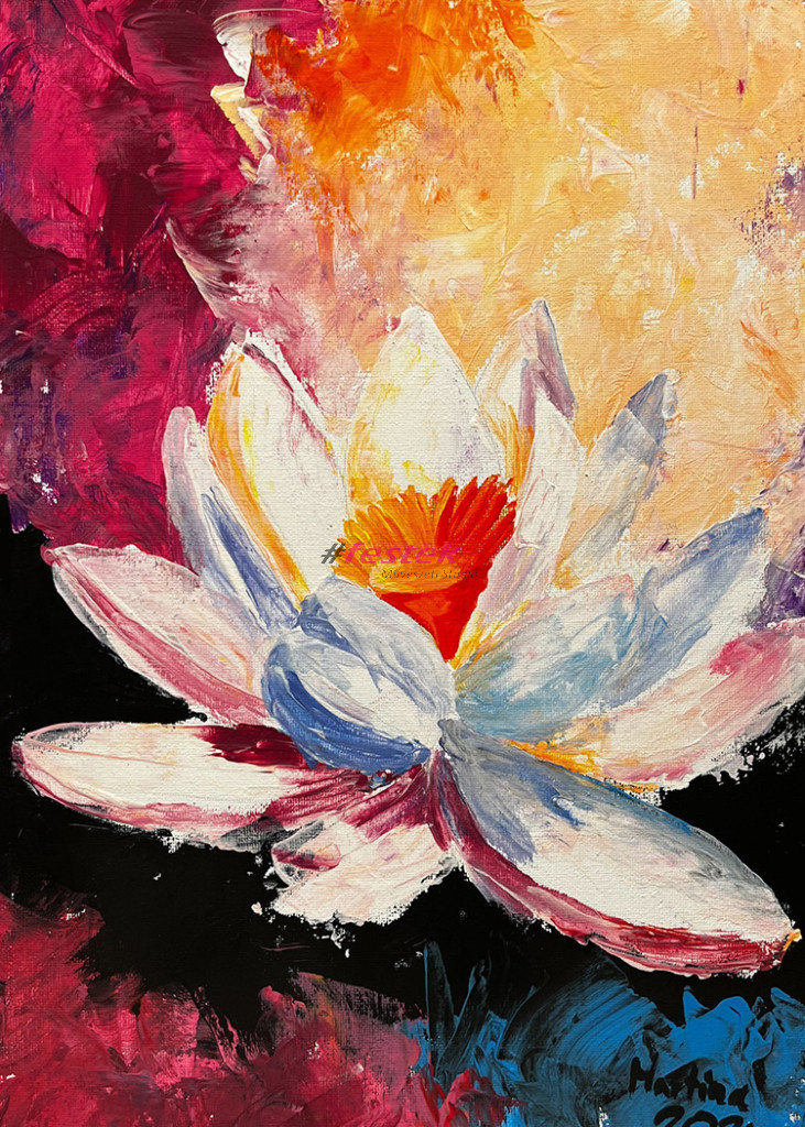 Kézzel festett akril festmény fa keretre feszített vásznon.
