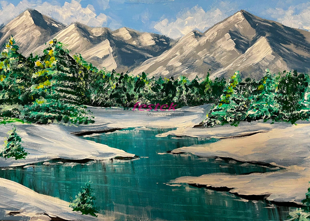 Kézzel festett akril festmény fa keretre feszített vásznon.