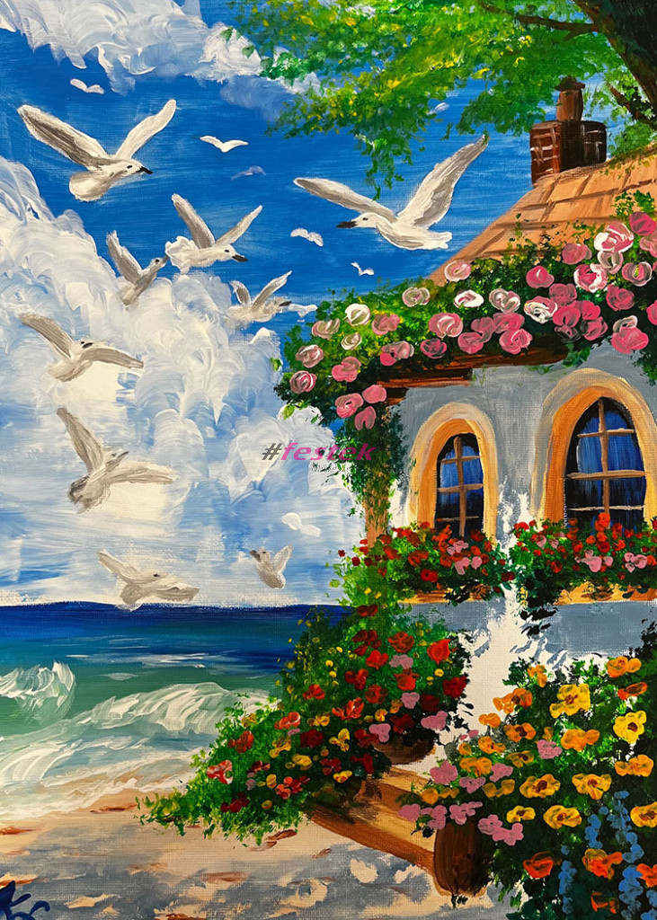Kézzel festett akril festmény fa keretre feszített vásznon.