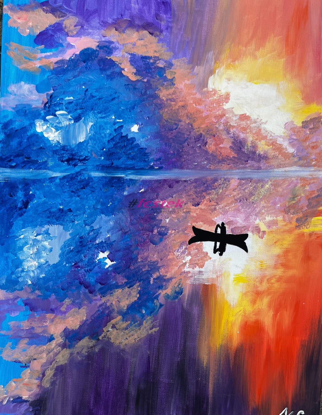 Kézzel festett akril festmény fa keretre feszített vásznon.